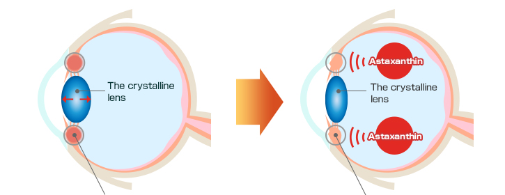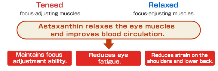 By taking Astaxanthin, eye muscle tension is relieved, helping maintain focus adjustment ability. As a result, it can not only reduce eye fatigue but also help ease the burden on your shoulders and lower back.