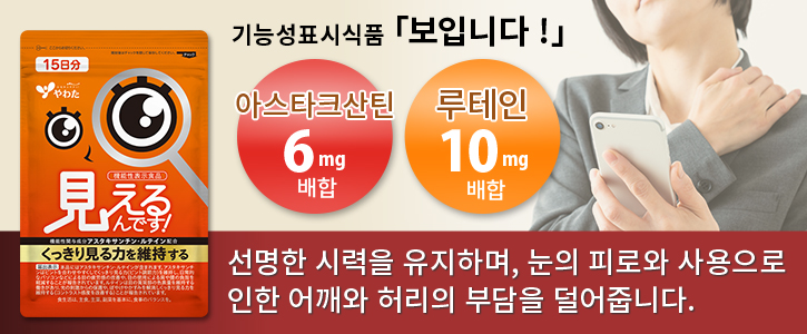 【신고표시】본 제품에는 아스타잔틴·루테인이 함유되어 있습니다. 아스타잔틴은 초점이 잘 맞춰지고 시야가 선명해지는 초점 조절력을 유지하며, 일상적인 컴퓨터 사용 등으로 인한 눈의 피로감을 개선하고 눈의 과사용으로 생긴 어깨와 허리의 부담을 줄여준다는 보고가 있습니다. 루테인은 눈의 황반부의 색소량을 유지하는 작용이 있으며, 빛의 자극으로부터 눈을 보호하여 흐린 시야와 뿌연 증상을 해소하고 선명하게 보는 힘(명암 대비 감도)을 유지한다는 보고도 있습니다.