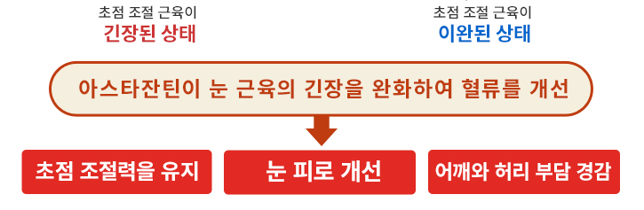 아스타잔틴을 섭취하면 눈 근육의 긴장을 완화시켜 초점 조절 기능 유지에 도움이 됩니다. 그 결과 눈의 피로뿐만 아니라 어깨와 허리의 부담도 줄어들 것으로 기대됩니다.