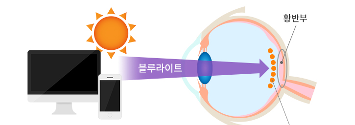 TV, 컴퓨터, 스마트폰 등에서 방출되는 블루라이트는 자외선에 가까운 매우 높은 에너지를 가지고 있어, 눈의 깊은 곳에 있는 망막까지 도달하며 눈에 부담을 줄 수 있습니다. 또, 블루라이트는 빛이 산란하는 성질이 있어, 명암 대비 감도를 저하시켜 흐린 시야와 뿌연 증상의 원인이 되기도 합니다.
