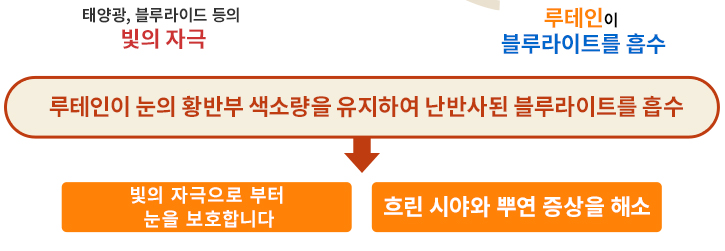 루테인 섭취는 눈을 블루라이트 등으로부터 보호하고, 황반부 색소를 유지해 난반사된 블루라이트를 흡수함으로써 흐린 시야와 뿌연 증상 해소에 도움을 줍니다.